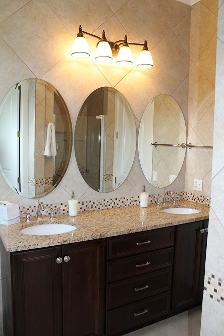 Previous Image Next Image 18 – 666 vertical pix The Master Bathroom vanity has 2 sinks in a granite counter top.